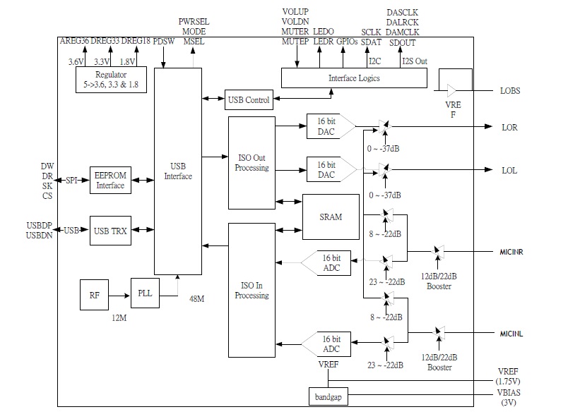 CM118B is a highly integrated single chip USB audio solution. All essential analog modules are embedded in CM118B, including dual DAC and headphone amplifier, ADC, microphone booster, PLL, crystal-less design, regulator, anti-pop circuitry and USB transceiver. Many features are programmable with jumper pins or external EEPROM such as microphone only mode for both mono and stereo microphone.