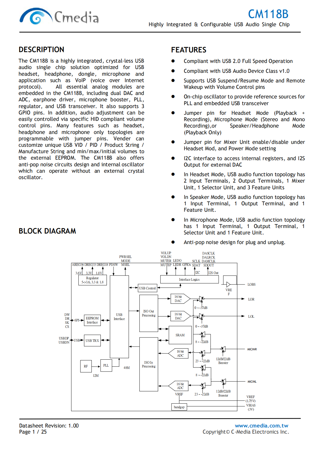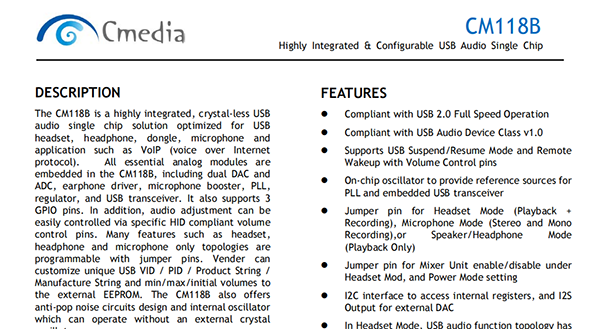 The CM118B is a highly integrated, crystal-less USB audio single chip solution optimized for USB headset, headphone, dongle, microphone and application such as VoIP (voice over Internet protocol)