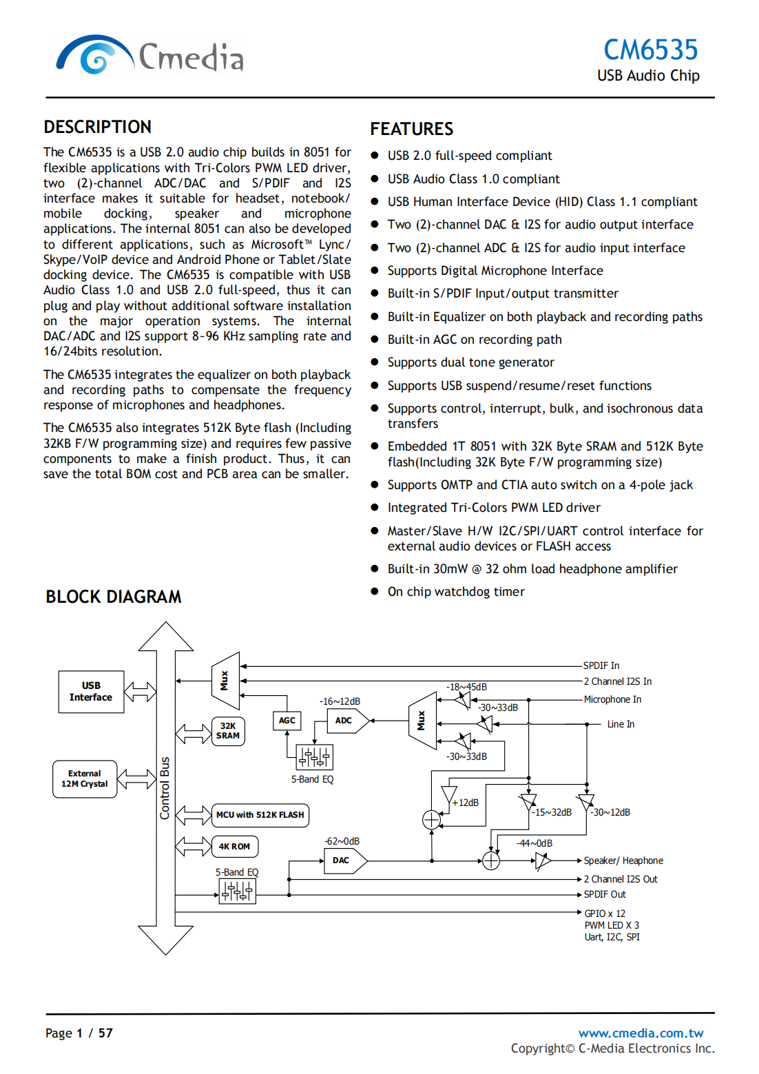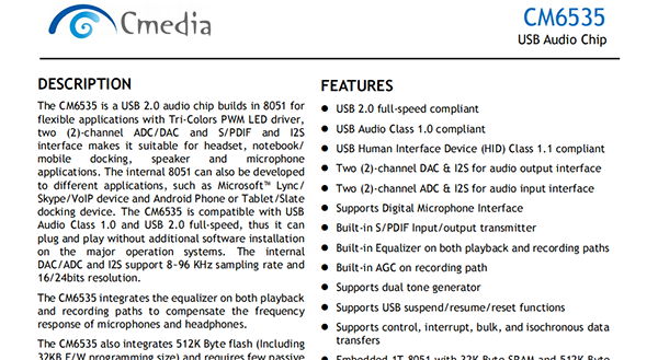 The CM6535 is a USB 2.0 audio chip builds in 8051 for flexible applications with Tri-Colors PWM LED driver, two (2)-channel ADC/DAC and S/PDIF and I2S interface makes it suitable for headset, notebook/ mobile docking, speaker and microphone applications
