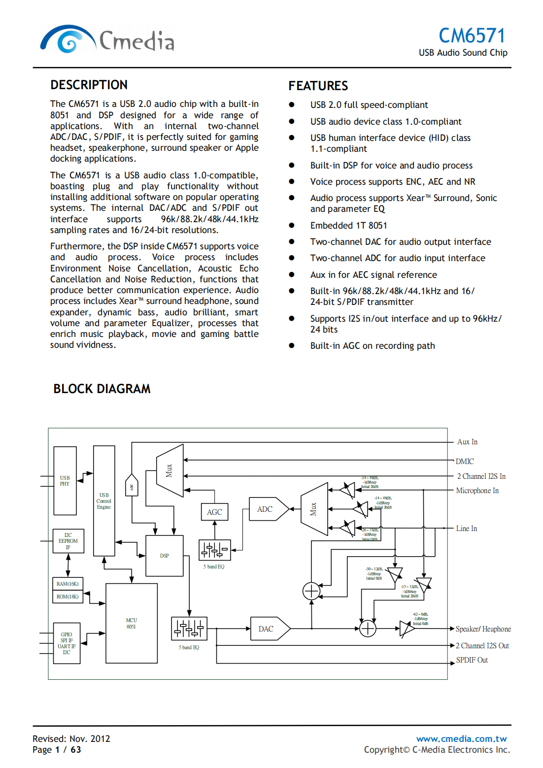 The CM6571 is a USB 2.0 audio chip with a built-in 8051 and DSP designed for a wide range of applications