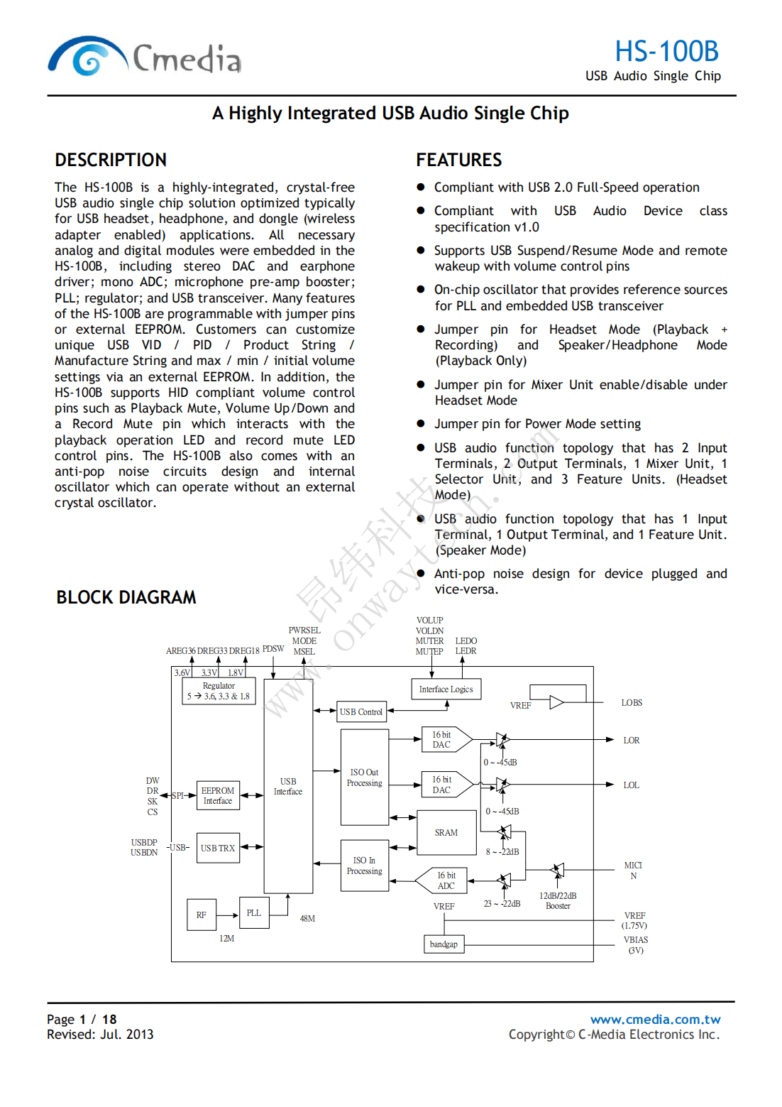 The HS-100B is a highly-integrated, crystal-free USB audio single chip solution optimized typically for USB headset, headphone, and dongle (wireless adapter enabled) applications