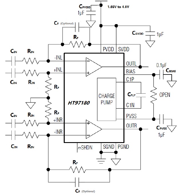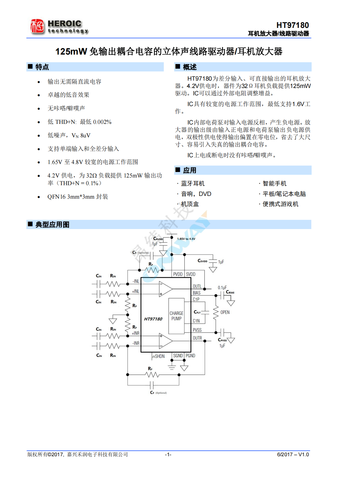 HT97180(L)是一款差分輸入/單端輸入、可直接輸出驅(qū)動的耳機放大器/線路驅(qū)動器。4.2V供電時,器件可為32ohm耳機提供125mW的功率而不失真。器件可通過外部電阻調(diào)節(jié)增益(固定增益6dB版本需要提前定制)。器件在音頻范圍內(nèi)具有卓越的THD+N表現(xiàn)。