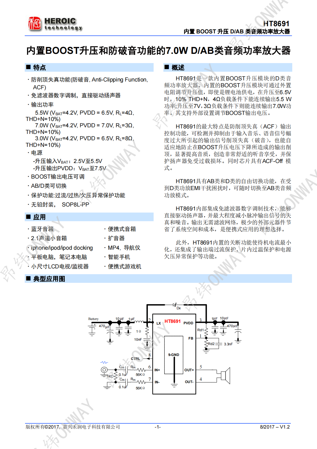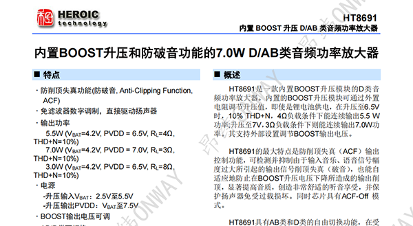 HT8691是一款內(nèi)置BOOST升壓模塊的D類音頻功率放大器。內(nèi)置的BOOST升壓模塊可通過外置電阻調(diào)節(jié)升壓值,即使是鋰電池供電,在升壓至6.5V時,10%THD+N,4Ω負(fù)載條件下能連續(xù)輸出5.5 W功率;升壓至7V,3Ω負(fù)載條件下則能連續(xù)輸出7.0W功率。其支持外部設(shè)置調(diào)節(jié)BOOST輸出電壓。HT8691的最大特點是防削頂失真(ACF)輸出控制功能,可檢測并抑制由于輸入音樂、語音信號幅度過大所引起的輸出信號削頂失真(破音),也能自適應(yīng)地防止在BOOST升壓電壓下降所造成的輸出削頂,顯著提高音質(zhì),創(chuàng)造非常舒適的聽音享受,并保護揚聲器免受過載損壞。同時芯片具有ACF-Off模式。