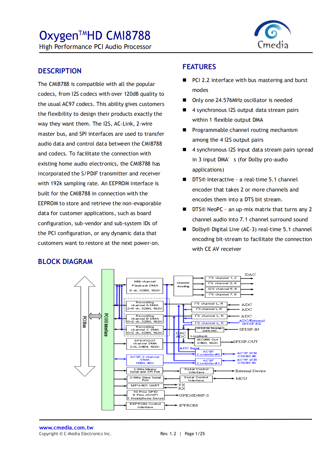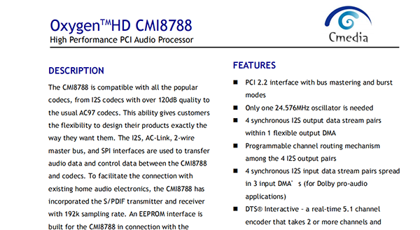 The CMI8788 is compatible with all the popular codecs, from I2S codecs with over 120dB quality to the usual AC97 codecs. This ability gives customers the flexibility to design their products exactly the way they want them