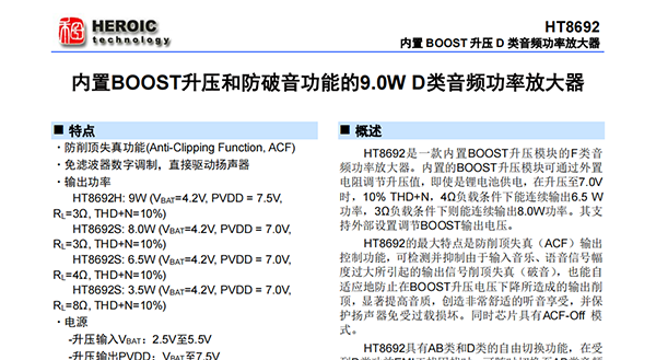 HT8692是一款內(nèi)置BOOST升壓模塊的F類音 頻功率放大器。內(nèi)置的BOOST升壓模塊可通過外置 電阻調(diào)節(jié)升壓值,即使是鋰電池供電,在升壓至7.0V 時,10% THD+N,4Ω負(fù)載條件下能連續(xù)輸出6.5 W 功率,3Ω負(fù)載條件下則能連續(xù)輸出8.0W功率。其支 持外部設(shè)置調(diào)節(jié)BOOST輸出電壓