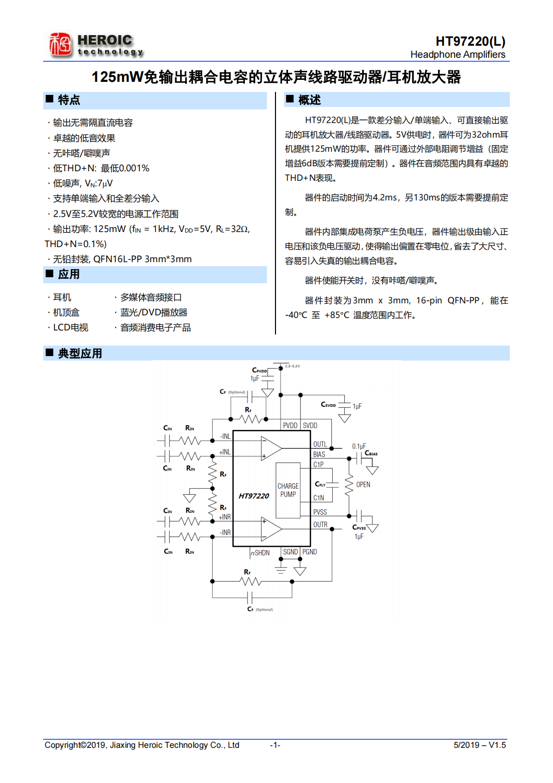 HT97220(L)是一款差分輸入/單端輸入、可直接輸出驅(qū)動(dòng)的耳機(jī)放大器/線路驅(qū)動(dòng)器。5V供電時(shí),器件可為32ohm耳機(jī)提供125mW的功率。器件可通過外部電阻調(diào)節(jié)增益(固定增益6dB版本需要提前定制)。器件在音頻范圍內(nèi)具有卓越的THD+N表現(xiàn)。器件的啟動(dòng)時(shí)間為4.2ms,另130ms的版本需要提前定制。器件內(nèi)部集成電荷泵產(chǎn)生負(fù)電壓,器件輸出級由輸入正電壓和該負(fù)電壓驅(qū)動(dòng),使得輸出偏置在零電位,省去了大尺寸、容易引入失真的輸出耦合電容。器件使能開關(guān)時(shí),沒有咔嗒/噼噗聲。
