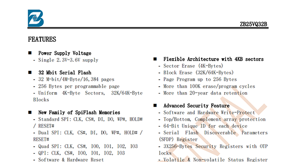 The ZB25VQ32B of non-volatile flash memory device supports the standard Serial Peripheral Interface (SPI)