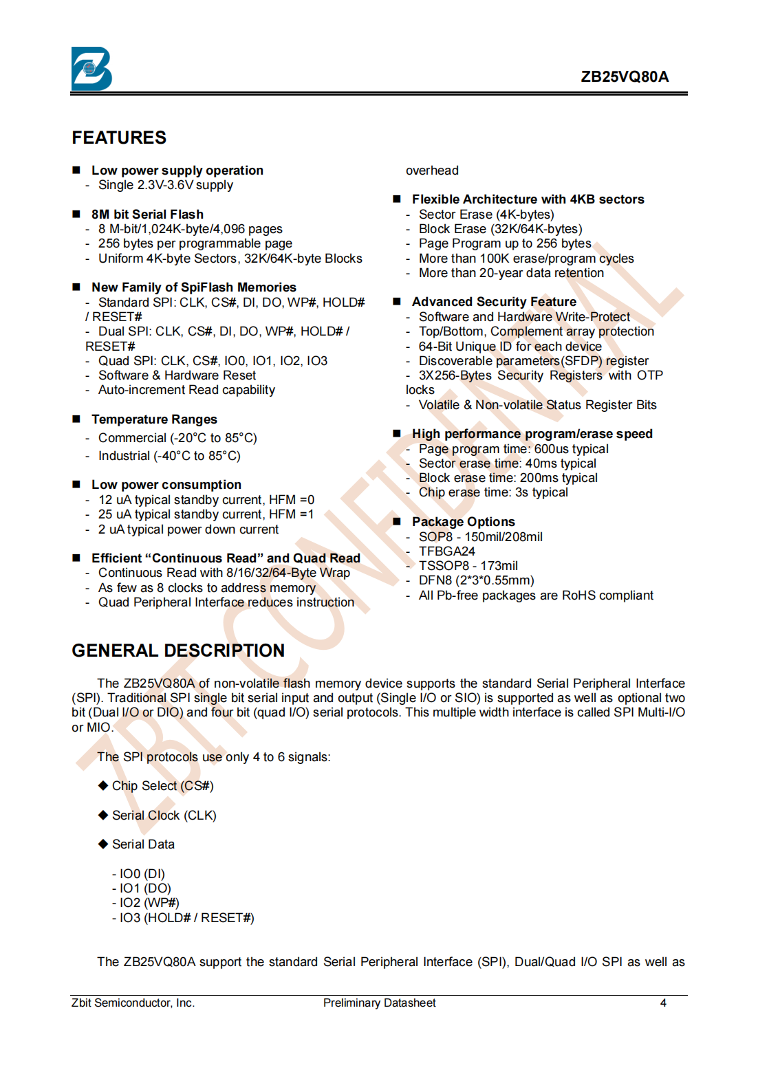 The ZB25VQ80A of non-volatile flash memory device supports the standard Serial Peripheral Interface (SPI)