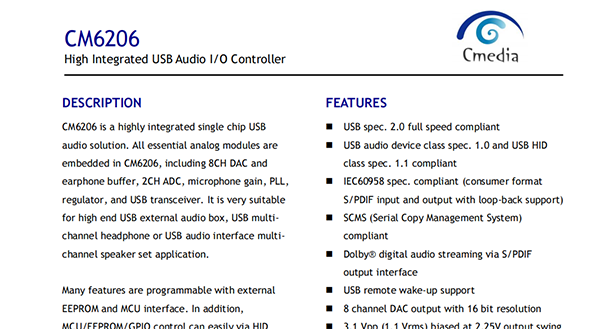 CM6206 is a highly integrated single chip USB audio solution. All essential analog modules are embedded in CM6206, including 8CH DAC and earphone buffer, 2CH ADC, microphone gain, PLL, regulator, and USB transceiver.