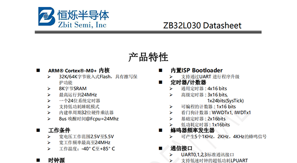 ZB32L030是一款使用高性能的Arm?Cortex-M0+為內(nèi)核的32位微控制器。最高頻率可達(dá)24MHZ,同時(shí)兼具低功耗的特性,深度睡眠模式下功耗僅為0.7uA。該芯片內(nèi)置高速存儲(chǔ)器,豐富的I/O端口和多種通用外設(shè)