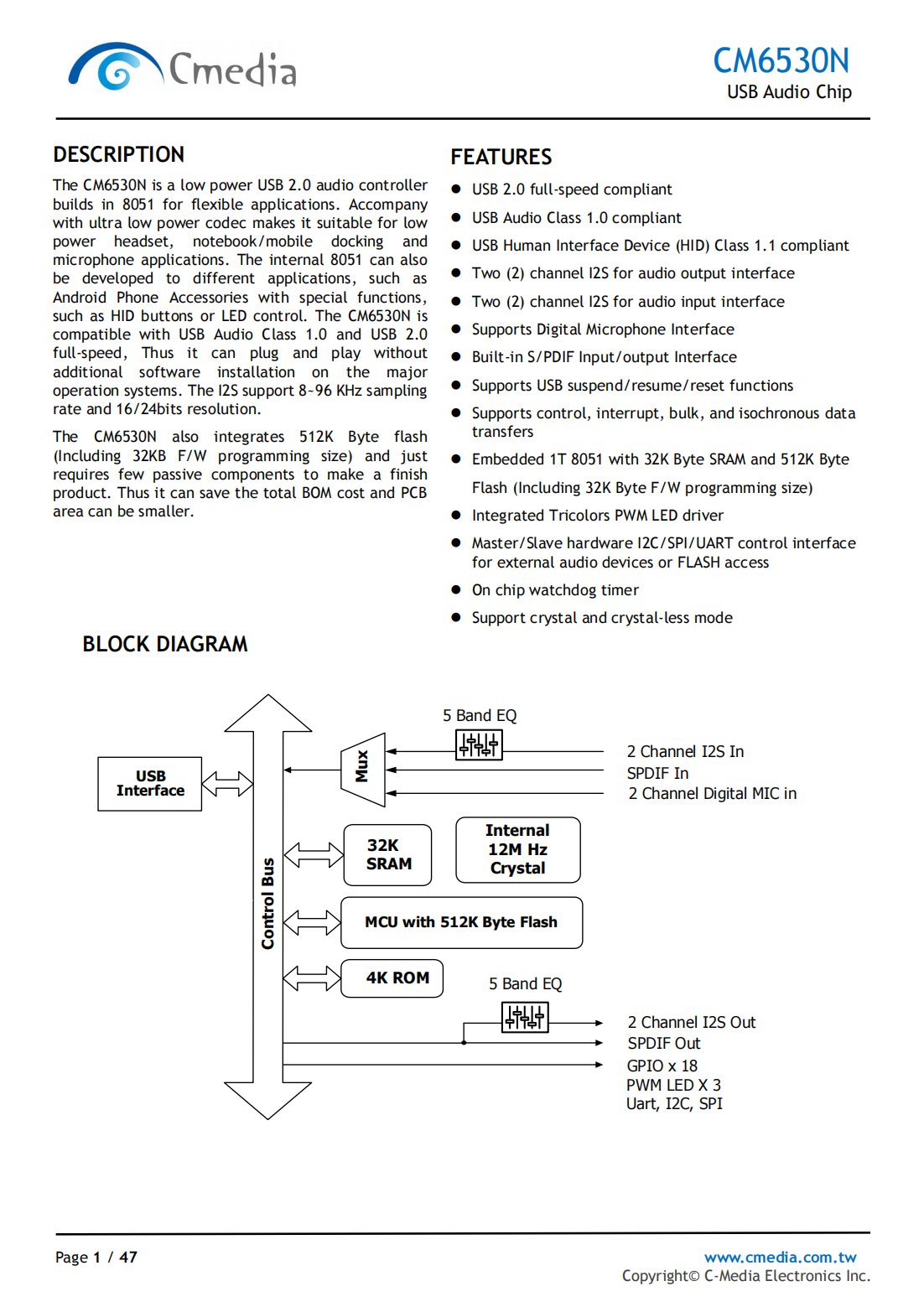 The CM6530N is a low power USB 2.0 audio controller builds in 8051 for flexible applications. Accompany with ultra low power codec makes it suitable for low power headset, notebook/mobile docking and microphone applications