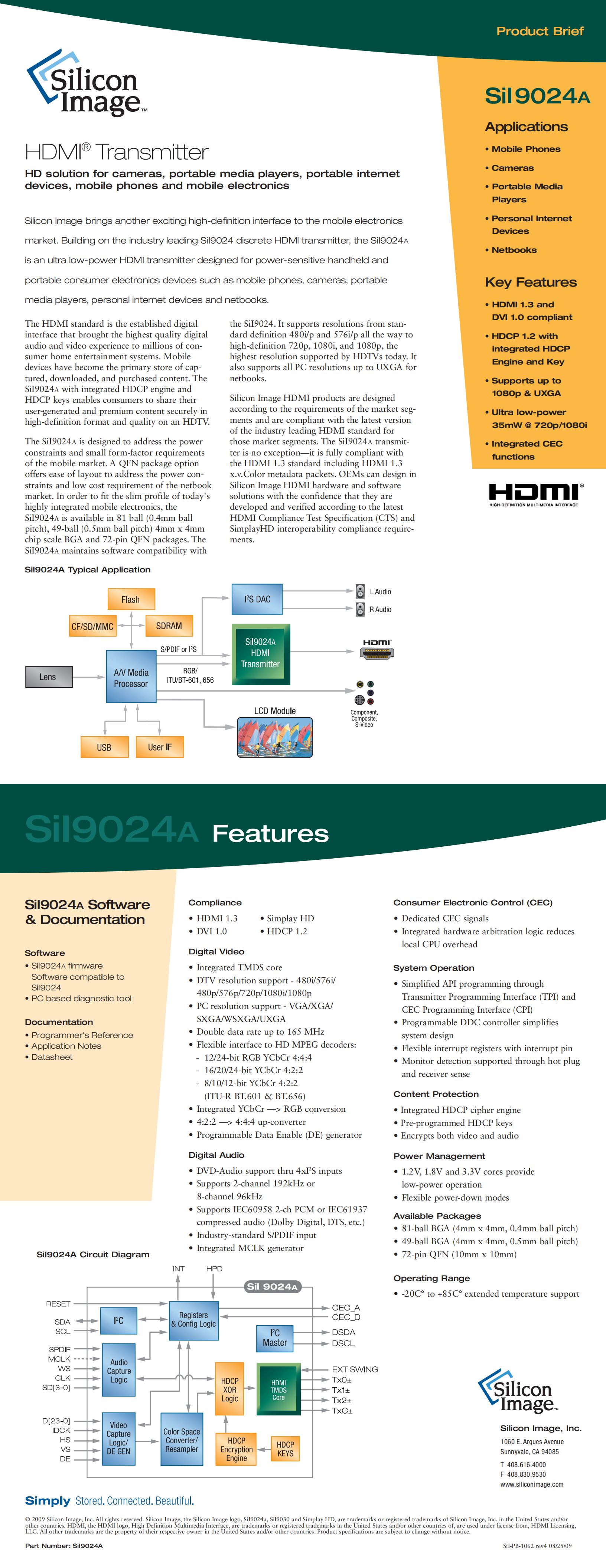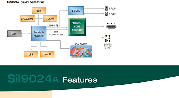 Silicon Image brings another exciting high-definition interface to the mobile electronics market. Building on the industry leading SiI9024 discrete HDMI transmitter, the SiI9024A is an ultra low-power HDMI transmitter designed for power-sensitive handheld and portable consumer electronics devices such as mobile phones, cameras, portable media players, personal internet devices and netbooks