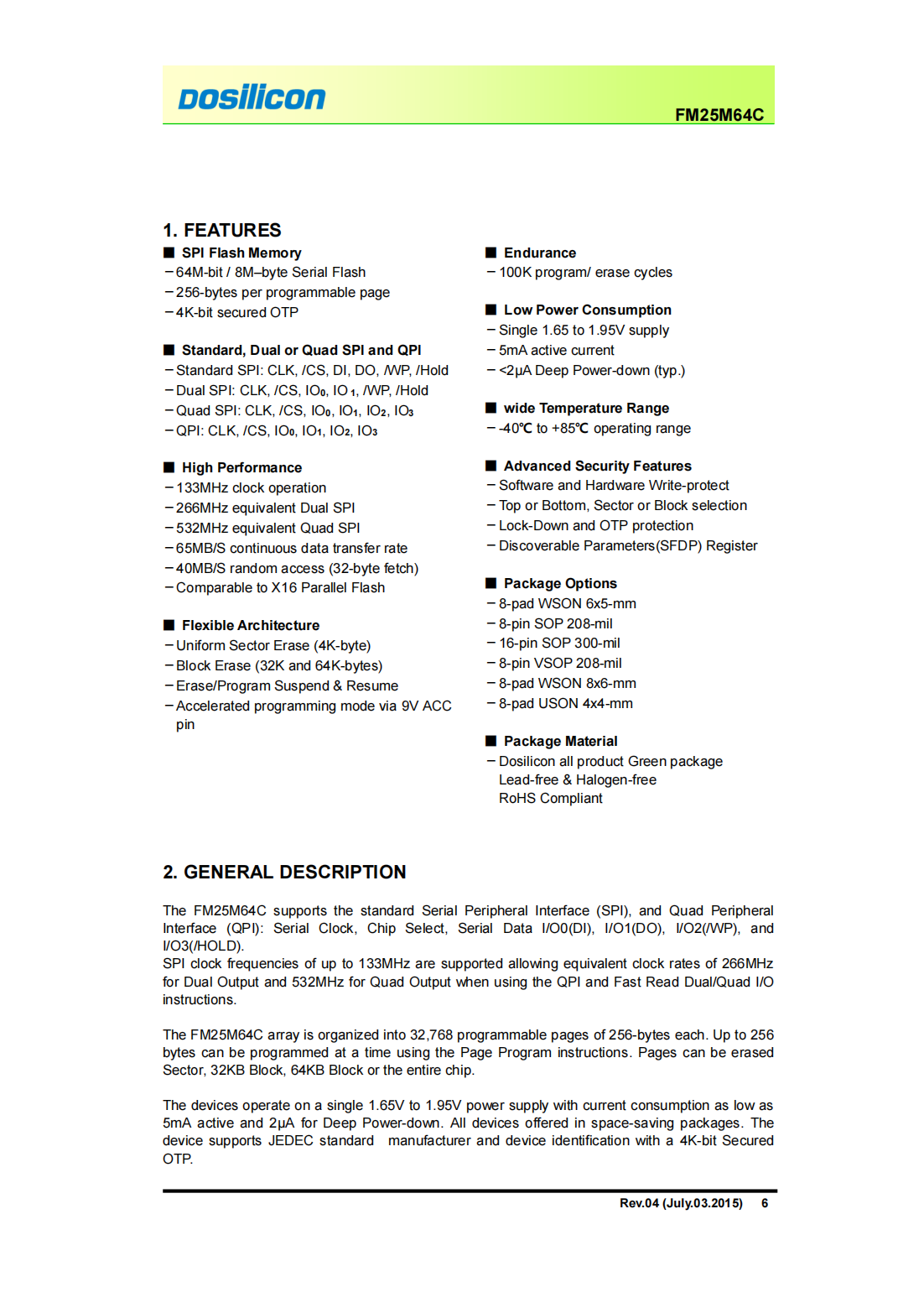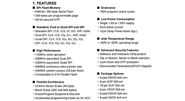 1.8V 64M-BIT Serial Flash Memory with 4KB Sectors, Dual and Quad I/O SPI & QPI
