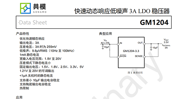 GM1204是一款低壓差穩(wěn)壓器,專為快速瞬態(tài)響應而優(yōu)化。該裝置能夠提供3A的輸出電流,典型壓降為255mV。工作靜態(tài)電流為1mA,關機時降至1μA以下。壓差模式下靜態(tài)電流控制良好;與許多其他穩(wěn)壓器一樣,靜態(tài)電流在壓差模式下并沒有上升。除了快速瞬態(tài)響應外,GM1204還具有非常低的輸出電壓噪聲,這使得該器件非常適合敏感的射頻電源應用。輸出電壓范圍為1.21V至20V。GM1204穩(wěn)壓器穩(wěn)定,輸出電容低至10μF。內(nèi)部保護電路包括電流限制和熱限制。該器件有1.5V、1.8V、2.5V、3.3V、5V的固定輸出電壓,以及1.21V參考電壓的可調(diào)輸出電壓。GM1204穩(wěn)壓器是5引腳TO-263封裝和TSSOP-16封裝。