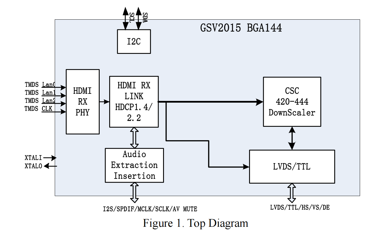 GSV2015 可替代IT68051 IT68052 HDMI2.0 Receiver,音頻分離和Downscaling,同時支持LVDS和TTL接口,支持HDMI2.0 + HDCP2.2/1.4。