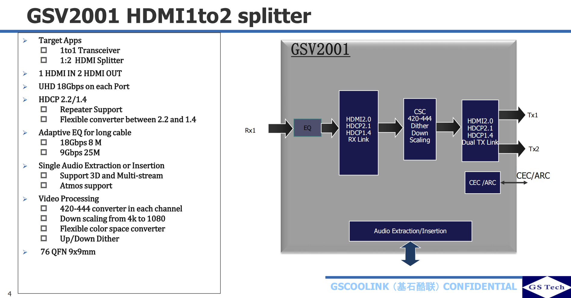 GSV2001高性價比HDMI2.0/HDCP2.2 1to2 Splitter,支持DownScaler,CSC及音頻分離和音頻嵌入,支持ARC及CEC功能??梢蕴娲鶬TE CH6001/IT6663 EP9162S LT86012