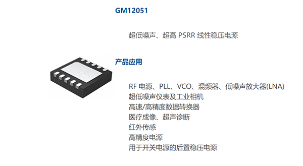 GM12051 是一款高性能低壓差線性穩(wěn)壓電源,其采用的超低噪聲和超高電源抑制比(PSRR)架構(gòu)對(duì)噪聲敏感的信號(hào)采集和無線通信應(yīng)用供電