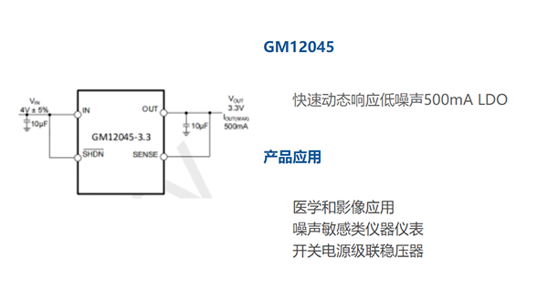 GM12045是一款低壓差穩(wěn)壓器,專為快速瞬態(tài)響應(yīng)而優(yōu)化。該裝置能夠提供500mA的輸出電流,典型壓降為100mV。工作靜態(tài)電流為1mA,關(guān)機(jī)時(shí)降至1μA以下,同時(shí)壓差模式下靜態(tài)電流控制良好。除了快速瞬態(tài)響應(yīng)外,GM12045還具有8.8μVRMS的低輸出電壓噪聲和高達(dá)81dB的電源紋波抑制比,這使得該器件非常適合敏感的儀器儀表和醫(yī)療影像應(yīng)用。