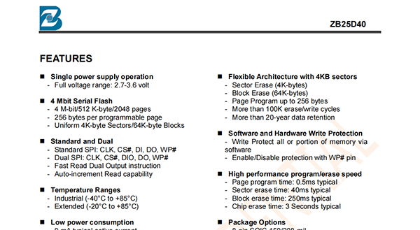 ?The ZB25D40 is designed to allow either single Sector/Block at a time or full chip erase operation.The ZB25D40 can be configured to protect part of the memory as the software protected mode.The device can sustain a minimum of 100K program/erase cycles on each sector or block.