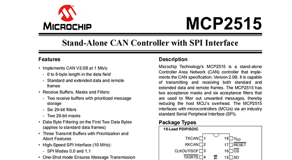 Microchip Technology’s MCP2515 is a stand-alone Controller Area Network(CAN)controller that implements the CAN specification,Version 2.0B.It is capable of transmitting and receiving both standard and extended data and remote frames.The MCP2515 has two acceptance masks and six acceptance filters that are used to filter out unwanted messages,thereby reducing the host MCU’s overhead.The MCP2515 interfaces with microcontrollers(MCUs)via an industry standard Serial Peripheral Interface(SPI).
