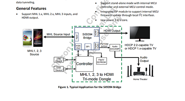 The Silicon Image SiI9394 Mobile High-Definition Link(MHL®)1,2,3 to High-Definition Multimedia Interface(HMDI®)bridge is an advanced integrated Highdefinition(HD)solution which can receive the latest MHL 1.x,MHL 2.x with High-bandwidth Digital Content Protection(HDCP)1.4 encryption or MHL 3 with HDCP2.2 encryption inputs,and support HDMI output with HDCP 1.4 or HDCP 2.2 encryption.The SiI9394 device can support up to 4K x 2K Ultra HD video format.