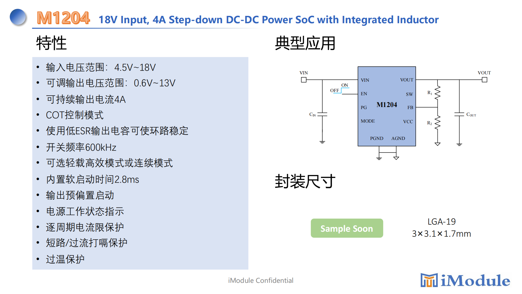 The M1204L is a 4A step-down switching mode Power SoC(System on Chip)with integrated power MosFETs,inductor in LGA-19 package.The input voltage is from 3V to 16V and the switching frequency is fixed at 1.4MHz.