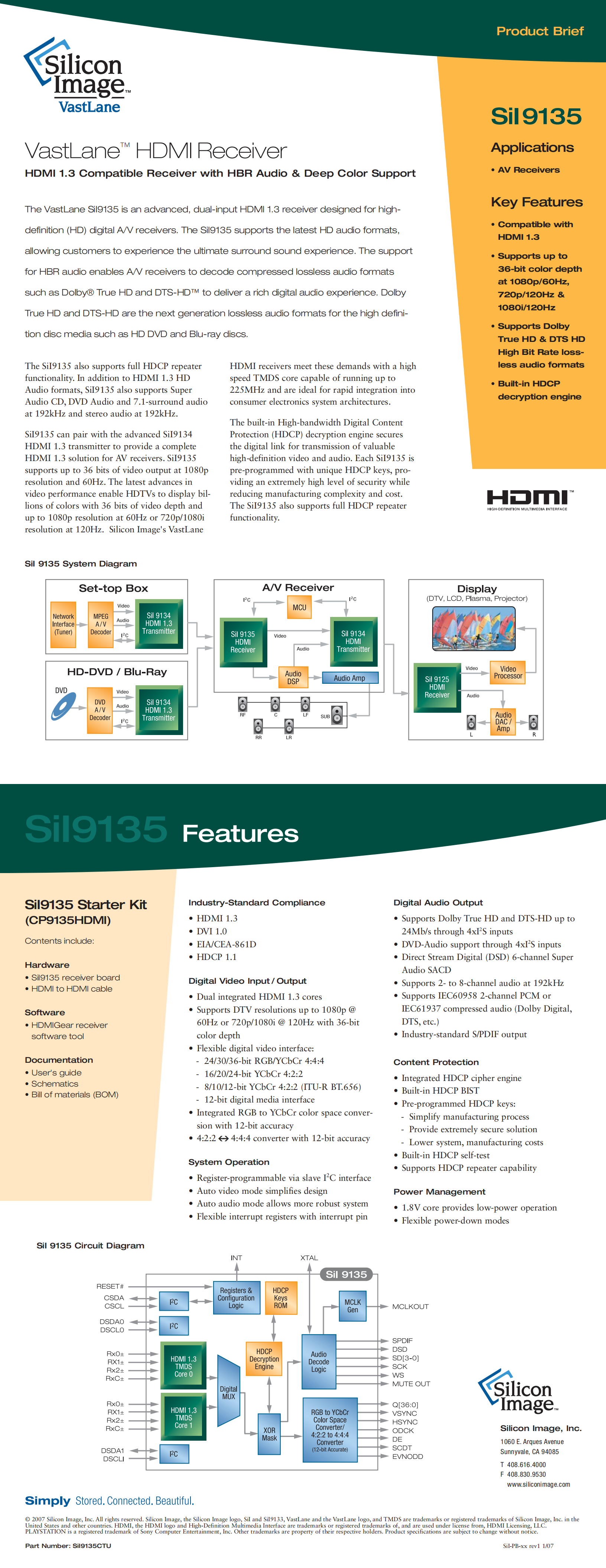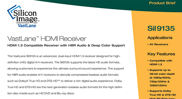 The VastLane SiI9135 is an advanced,dual-input HDMI 1.3 receiver designed for highdefinition(HD)digital A/V receivers.The SiI9135 supports the latest HD audio formats,allowing customers to experience the ultimate surround sound experience.The support for HBR audio enables A/V receivers to decode compressed lossless audio formats such as Dolby®True HD and DTS-HD?to deliver a rich digital audio experience.Dolby True HD and DTS-HD are the next generation lossless audio formats for the high definition disc media such as HD DVD and Blu-ray discs.