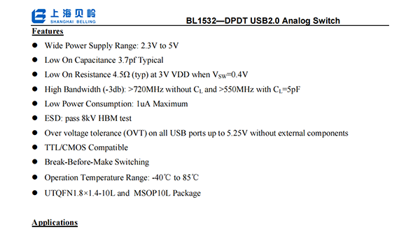 The BL1532 is a Low-Power,Two-Port,High-Speed,USB2.0(480Mbps)double–pole double-throw(DPDT)Analog Switch featuring an On-Resistance of 4.5 ohm at VCC=3V and a Low On Capacitance 3.7pf Typical.