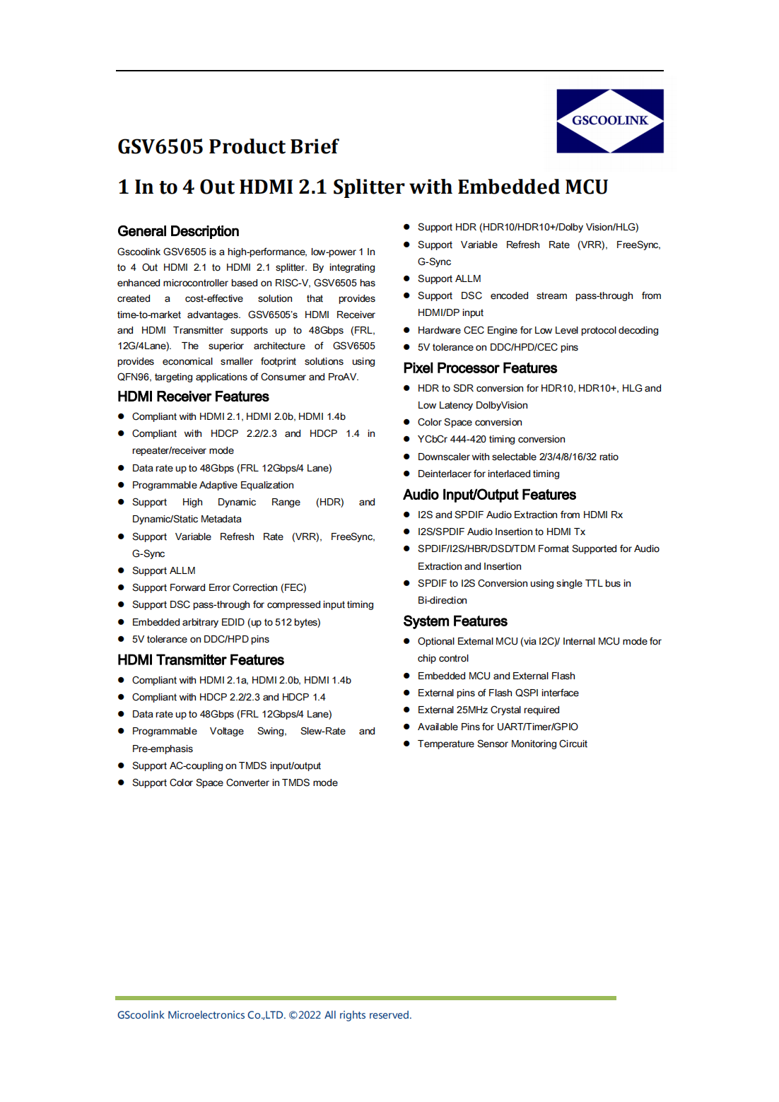 Gscoolink GSV6505 is a high-performance,low-power 1 In to 4 Out HDMI 2.1 to HDMI 2.1 splitter.By integrating enhanced microcontroller based on RISC-V,GSV6505 has created a cost-effective solution that provides time-to-market advantages.GSV6505’s HDMI Receiver and HDMI Transmitter supports up to 48Gbps(FRL,12G/4Lane).The superior architecture of GSV6505 provides economical smaller footprint solutions using QFN96,targeting applications of Consumer and ProAV.