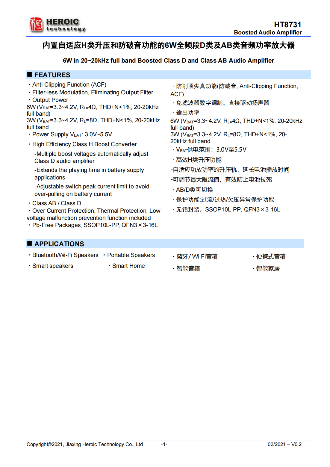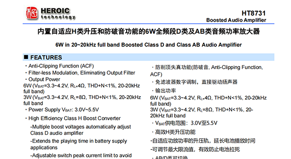 HT8731是一款內(nèi)置自適應(yīng)H類升壓的單聲道D類音頻功率放大器,由鋰電池供電時(shí),THD+N<1%、20-20kHz全頻段信號(hào)條件下,能連續(xù)輸出6W功率(4Ω負(fù)載);另外,其還支持AB類模式。
