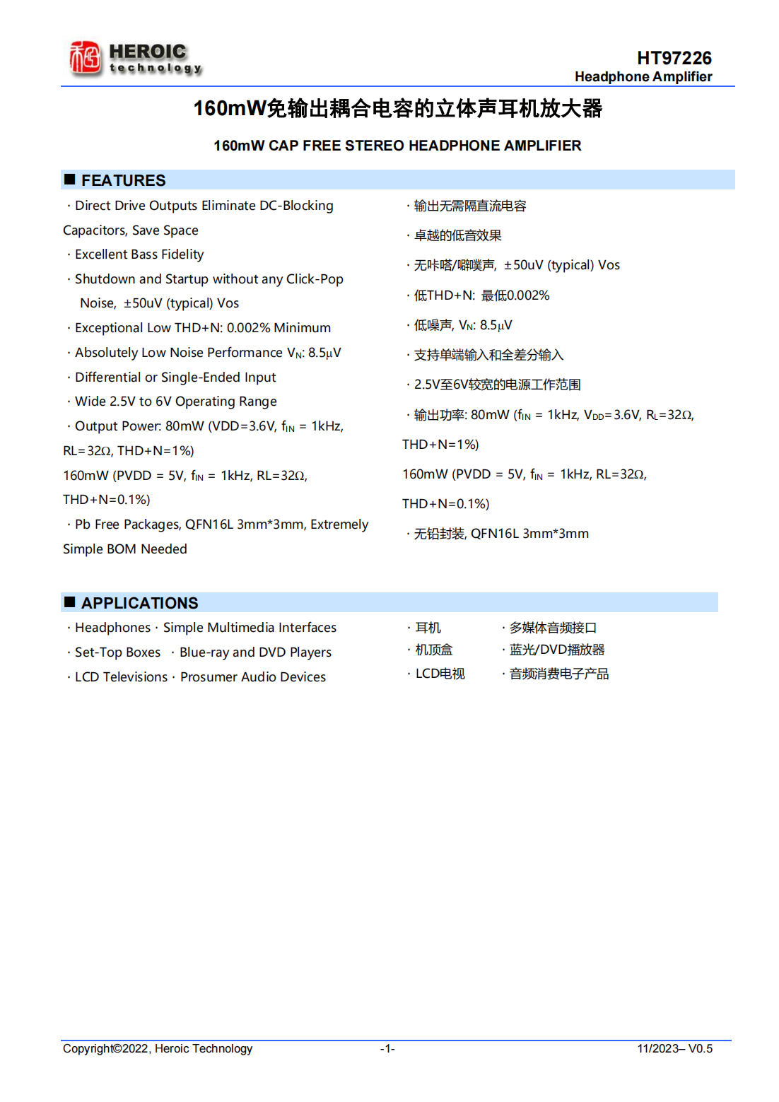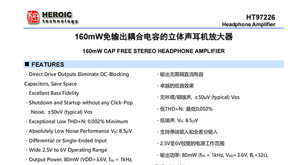 HT97226是一款差分輸入/單端輸入、可直接輸出驅(qū)動的耳機放大器。5V供電時,器件可為32ohm耳機提供180mW的功率。器件可通過外部電阻調(diào)節(jié)增益。器件在音頻范圍內(nèi)具有卓越的THD+N表現(xiàn)。