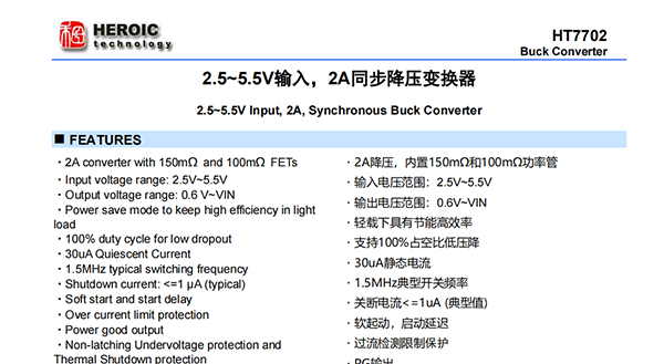 HT7702是一款2A同步降壓轉(zhuǎn)換器,具有最少的外部元件和低關(guān)斷電流。該器件在中到重載時(shí),工作在典型開關(guān)頻率為1.5MHz的PWM模式;在輕載時(shí),器件工作在高效節(jié)能模式。輸出電壓可通過(guò)外部電阻調(diào)節(jié)。HT7702采用SOT23-6封裝。