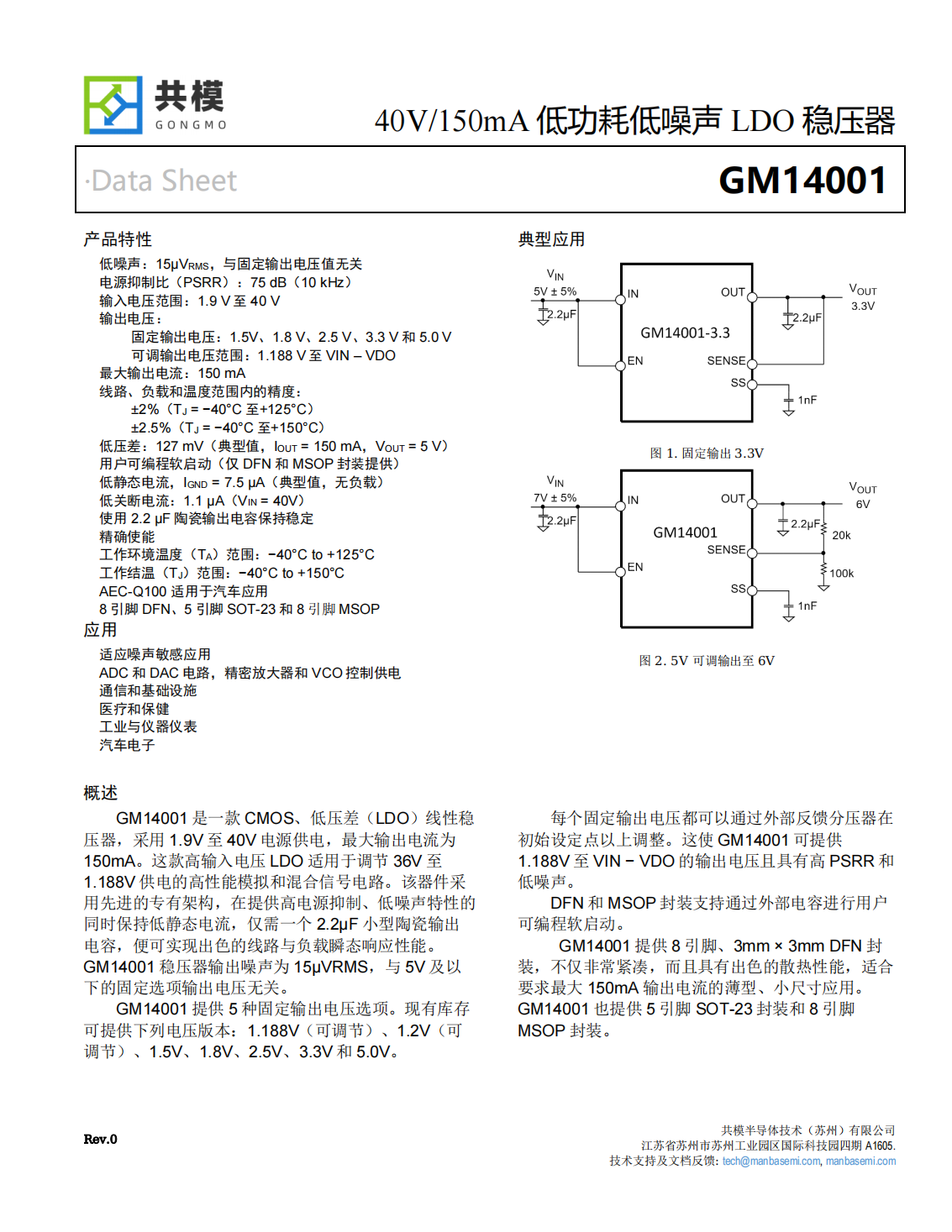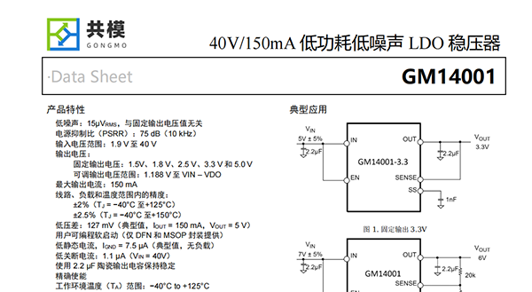 GM14001是一款CMOS、低壓差(LDO)線性穩(wěn)壓器,采用1.9V至40V電源供電,最大輸出電流為150mA。這款高輸入電壓LDO適用于調(diào)節(jié)36V至1.188V供電的高性能模擬和混合信號電路。該器件采用先進(jìn)的專有架構(gòu),在提供高電源抑制、低噪聲特性的同時(shí)保持低靜態(tài)電流,僅需一個(gè)2.2μF小型陶瓷輸出電容,便可實(shí)現(xiàn)出色的線路與負(fù)載瞬態(tài)響應(yīng)性能。