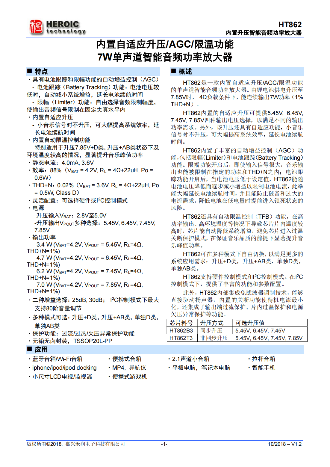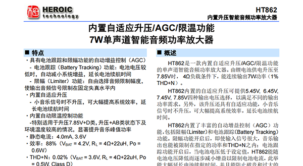 HT862是一款內置自適應升壓/AGC/限溫功能的單聲道智能音頻功率放大器。由鋰電池供電升壓至7.85V時,4Ω負載條件下,能連續(xù)輸出7W功率(1%THD+N)。
