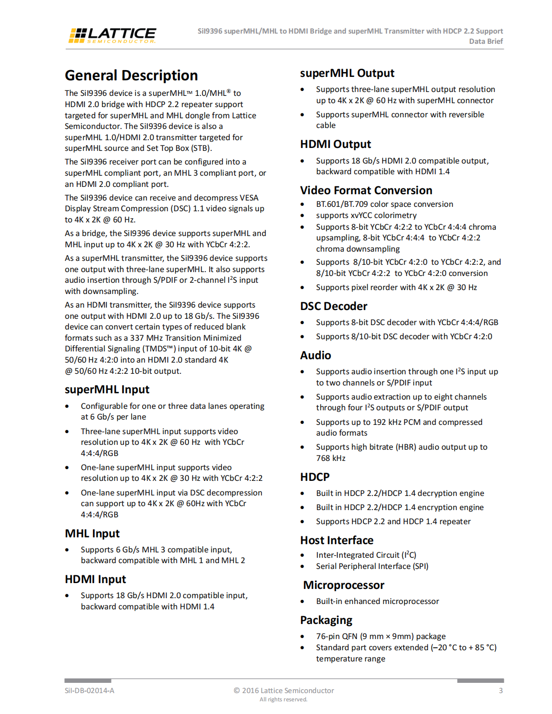 The SiI9396 receiver port can be configured into a superMHL compliant port,an MHL 3 compliant port,or an HDMI 2.0 compliant port.