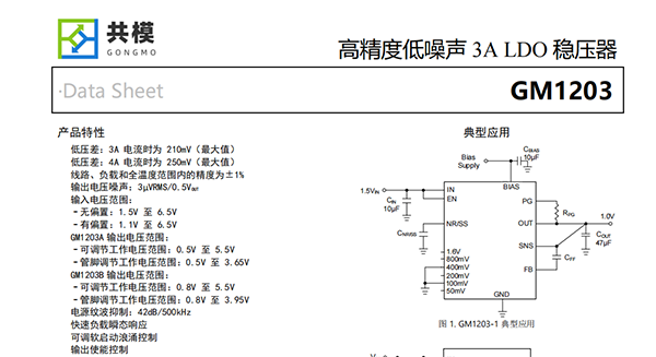 GM1203集低噪聲、高PSRR和高輸出電流能力等特性于一體,非常適合為高速通信、視頻、醫(yī)療或測(cè)試和測(cè)量應(yīng)用等噪聲敏感型組件供電。GM1203高性能的輸出品質(zhì),可抑電源產(chǎn)生的相位噪聲和時(shí)鐘抖動(dòng),因此它非常適合為高性能串行器和解串器(SerDes)、模數(shù)轉(zhuǎn)換器(ADC)、數(shù)模轉(zhuǎn)換器(DAC)和射頻組件供電。該器件具備快速負(fù)載瞬態(tài)響應(yīng)的性能和大于5V的輸出能力,尤其適合射頻放大器使用。對(duì)于需要以低輸入和低輸出電壓運(yùn)行的數(shù)字負(fù)載(例如專用集成電路(ASIC)、現(xiàn)場(chǎng)可編程門陣列(FPGA)和數(shù)字信號(hào)處理器(DSP)),GM1203所具備的高精度(在線路、負(fù)載和溫度范圍內(nèi)可達(dá)1%)、快速瞬態(tài)響應(yīng)性能和軟啟動(dòng)能力可確保實(shí)現(xiàn)出色的系統(tǒng)性能。外部使能控制和電源良好指示功能夠更容易的進(jìn)行時(shí)序控制。GM1203采用20腳3.5mm×3.5mm QFN和5mm×5mm QFN封裝,結(jié)溫范圍為TJ=-40°C to+125°C和TJ=-55°C to+125°C。