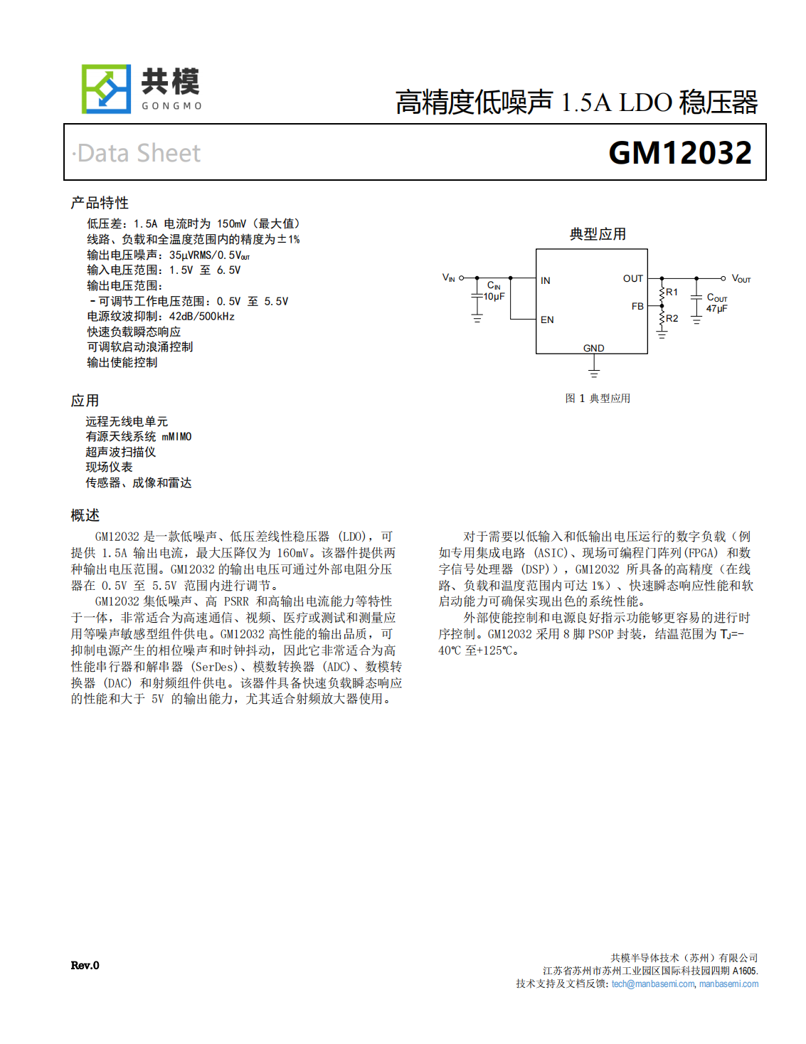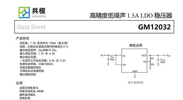 GM12032集低噪聲、高PSRR和高輸出電流能力等特性于一體,非常適合為高速通信、視頻、醫(yī)療或測(cè)試和測(cè)量應(yīng)用等噪聲敏感型組件供電。GM12032高性能的輸出品質(zhì),可抑制電源產(chǎn)生的相位噪聲和時(shí)鐘抖動(dòng),因此它非常適合為高性能串行器和解串器(SerDes)、模數(shù)轉(zhuǎn)換器(ADC)、數(shù)模轉(zhuǎn)換器(DAC)和射頻組件供電。該器件具備快速負(fù)載瞬態(tài)響應(yīng)的性能和大于5V的輸出能力,尤其適合射頻放大器使用。對(duì)于需要以低輸入和低輸出電壓運(yùn)行的數(shù)字負(fù)載(例如專用集成電路(ASIC)、現(xiàn)場(chǎng)可編程門陣列(FPGA)和數(shù)字信號(hào)處理器(DSP)),GM12032所具備的高精度(在線路、負(fù)載和溫度范圍內(nèi)可達(dá)1%)、快速瞬態(tài)響應(yīng)性能和軟啟動(dòng)能力可確保實(shí)現(xiàn)出色的系統(tǒng)性能。外部使能控制和電源良好指示功能夠更容易的進(jìn)行時(shí)序控制。GM12032采用8腳PSOP封裝,結(jié)溫范圍為TJ=-40°C至+125°C。