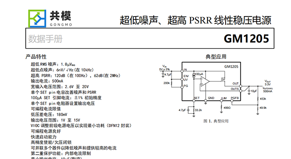 GM1205可在180mV典型壓差電壓條件下提供500mA。正常工作靜態(tài)電流的典型值為3.1mA,并在停機(jī)模式中低于1μA。該器件通過片外電阻調(diào)節(jié)輸出電壓,能夠在寬輸出電壓范圍(1V至15V)內(nèi)保持單位增益工作,從而提供幾乎恒定的輸出噪聲、PSRR、帶寬和負(fù)載調(diào)整率,并且這些性能與輸出電壓無關(guān)。此外,該穩(wěn)壓電源還擁有可編程電流限值、快速啟動(dòng)和用于指示輸出電壓調(diào)節(jié)的可編程電源良好信號(hào)。