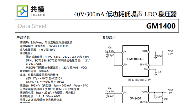GM1400是一款CMOS、低壓差(LDO)線性穩(wěn)壓器,采用1.9V至40V電源供電,最大輸出電流為300 mA。這款高輸入電壓LDO適用于調(diào)節(jié)36V至1.2V供電的高性能模擬和混合信號(hào)電路。該器件采用先進(jìn)的專(zhuān)有架構(gòu),在提供高電源抑制、低噪聲特性的同時(shí)保持低靜態(tài)電流,僅需一個(gè)2.2μF小型陶瓷輸出電容,便可實(shí)現(xiàn)出色的線路與負(fù)載瞬態(tài)響應(yīng)性能。GM1400穩(wěn)壓器輸出噪聲為8.5μVRMS,與5V及以下的固定選項(xiàng)輸出電壓無(wú)關(guān)。