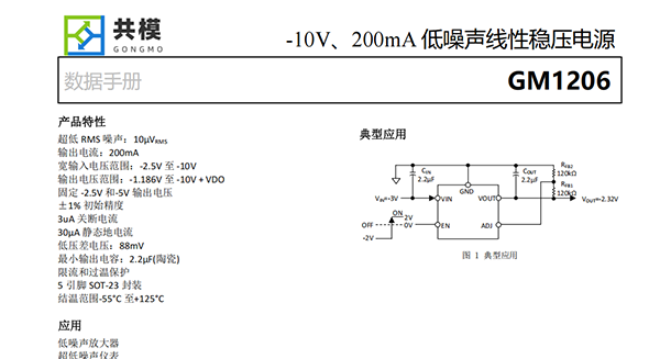 GM1206是一款微功率、低噪聲、低壓差負調壓器。該裝置能夠提供200mA的輸出電流,壓降為88mV。低靜態(tài)電流(30μA工作和3μA關機)使GM1206成為電池供電應用的最佳選擇,并且靜態(tài)電流在低壓差工況下得到了很好的控制。
