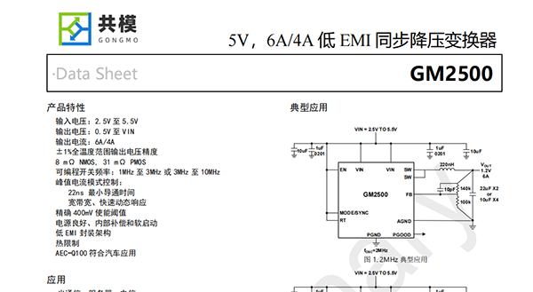 GM2500是一個(gè)非常小、高效、低噪音同步6A降壓直流/直流變換器,從2.5V到5.5V的輸入電源運(yùn)行。該變換器使用固定開(kāi)關(guān)頻率,在1MHz到10MHz時(shí)進(jìn)行峰值電流模式控制,最小開(kāi)關(guān)時(shí)間低至22ns,通過(guò)較小的外部組件實(shí)現(xiàn)快速瞬態(tài)響應(yīng)。低EMI封裝架構(gòu)可以最大限度地減少EMI排放。