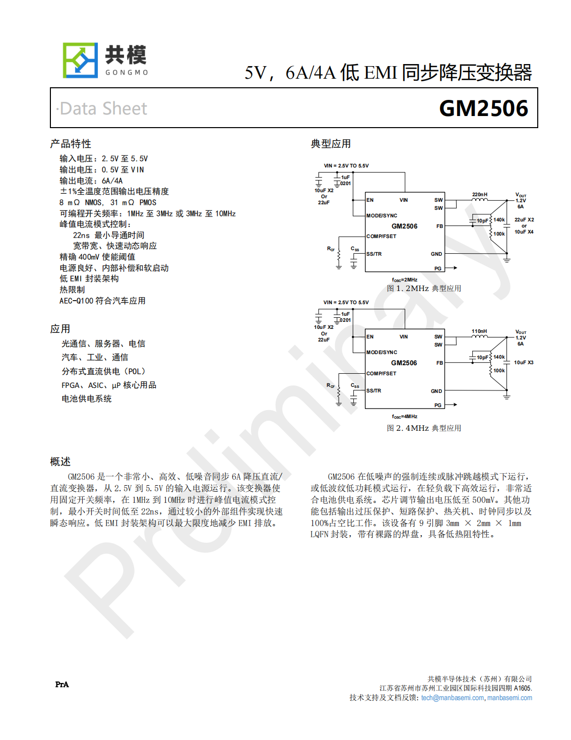 GM2506是一個(gè)非常小、高效、低噪音同步6A降壓直流/直流變換器,從2.5V到5.5V的輸入電源運(yùn)行。該變換器使用固定開(kāi)關(guān)頻率,在1MHz到10MHz時(shí)進(jìn)行峰值電流模式控制,最小開(kāi)關(guān)時(shí)間低至22ns,通過(guò)較小的外部組件實(shí)現(xiàn)快速瞬態(tài)響應(yīng)。低EMI封裝架構(gòu)可以最大限度地減少EMI排放。