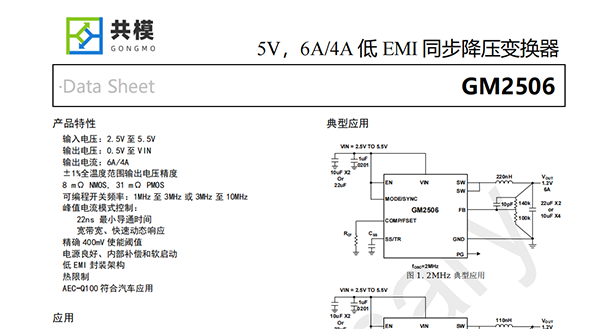 GM2506是一個非常小、高效、低噪音同步6A降壓直流/直流變換器,從2.5V到5.5V的輸入電源運行。該變換器使用固定開關頻率,在1MHz到10MHz時進行峰值電流模式控制,最小開關時間低至22ns,通過較小的外部組件實現(xiàn)快速瞬態(tài)響應。低EMI封裝架構可以最大限度地減少EMI排放。