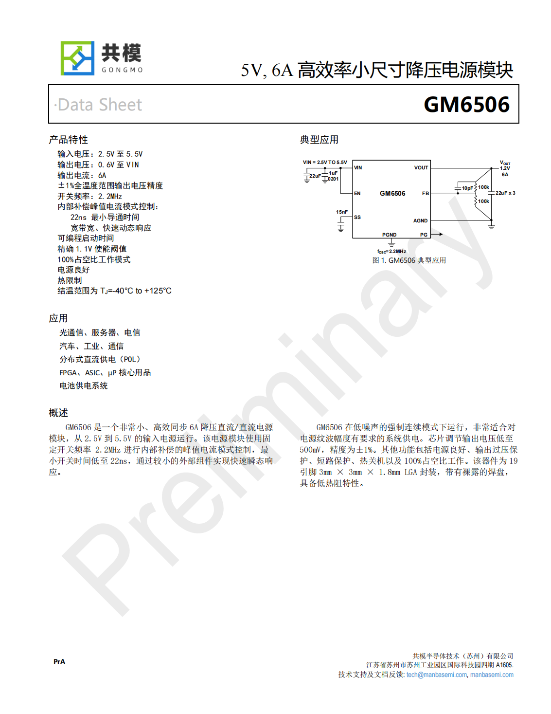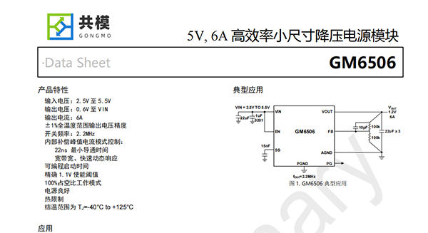 GM6506是一個(gè)非常小、高效同步6A降壓直流/直流電源模塊,從2.5V到5.5V的輸入電源運(yùn)行。該電源模塊使用固定開(kāi)關(guān)頻率1.6MHz進(jìn)行內(nèi)部補(bǔ)償?shù)姆逯惦娏髂J娇刂?,最小開(kāi)關(guān)時(shí)間低至22ns,通過(guò)較小的外部組件實(shí)現(xiàn)快速瞬態(tài)響應(yīng)。