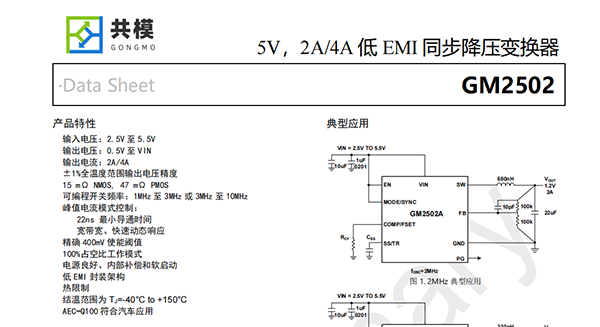 GM2502是一個非常小、高效、低噪音同步2A降壓直流/直流變換器,從2.5V到5.5V的輸入電源運行。該變換器使用固定開關頻率,在1MHz到10MHz時進行峰值電流模式控制,最小開關時間低至22ns,通過較小的外部組件實現(xiàn)快速瞬態(tài)響應。低EMI封裝架構(gòu)可以最大限度地減少EMI排放。