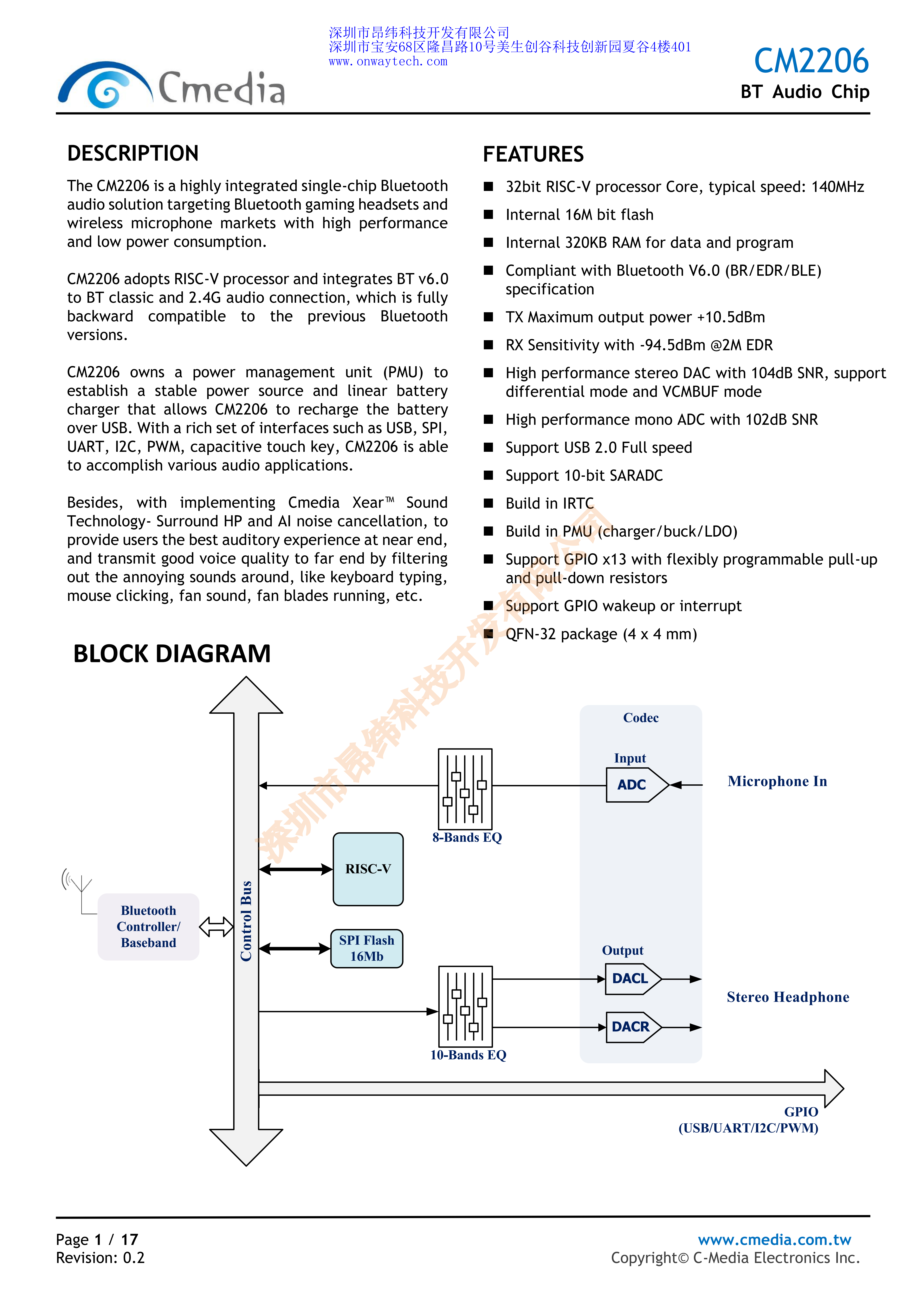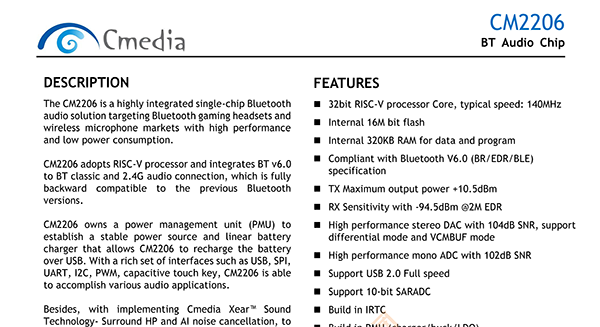 CM2206是一款高度集成的單片藍(lán)牙芯片,針對(duì)藍(lán)牙游戲耳機(jī)的音頻解決方案