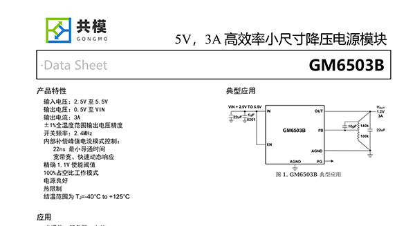 GM6503B是一個(gè)非常小、高效同步3A降壓直流/直流電源模塊,從2.5V到5.5V的輸入電源運(yùn)行。該電源模塊使用固定開(kāi)關(guān)頻率2.4MHz進(jìn)行內(nèi)部補(bǔ)償?shù)姆逯惦娏髂J娇刂疲钚¢_(kāi)關(guān)時(shí)間低至22ns,通過(guò)較小的外部組件實(shí)現(xiàn)快速瞬態(tài)響應(yīng)。