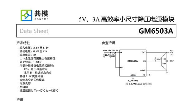 GM6503A是一個非常小、高效同步3A降壓直流/直流電源模塊,從2.5V到5.5V的輸入電源運行。該電源模塊使用固定開關(guān)頻率1.5MHz進行內(nèi)部補償?shù)姆逯惦娏髂J娇刂?,最小開關(guān)時間低至22ns,通過較小的外部組件實現(xiàn)快速瞬態(tài)響應(yīng)。